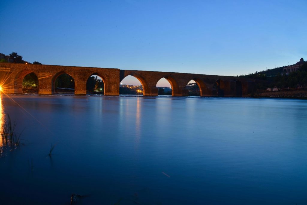 Also known as the Tigris Bridge, the Ten-Eyed Bridge unites the two banks of the Tigris with blocks constructed on ten disjoint arches. On the southern façade, between the arches and the railing, is a two-line floral Kufic inscription, indicating that it was commissioned in 1064-65 by Qadi Abu’l-Hasan Abdulwahid during the time of Nizam al-Dawla Nasr of the Marwanids and constructed by a architect named Ubeyd. However, researchers agree that this inscription is a renovation inscription and believe that the structure was built at a much earlier date.